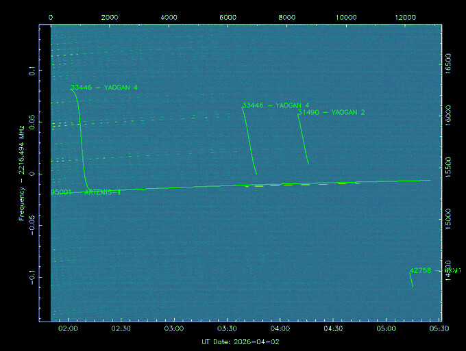 With the help of Nasa Horizons we could determine the location where to point the dish so Artemis-II would pass the beam of the antenna. This first night we used a the following fixed position, 195 Azimuth and 8 Elevation.